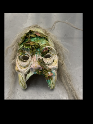 Papier Mache casting, acrylic sealer, polymer clay, methyl cellulose glue, acrylic paint, green flocking, flax fibers, wire